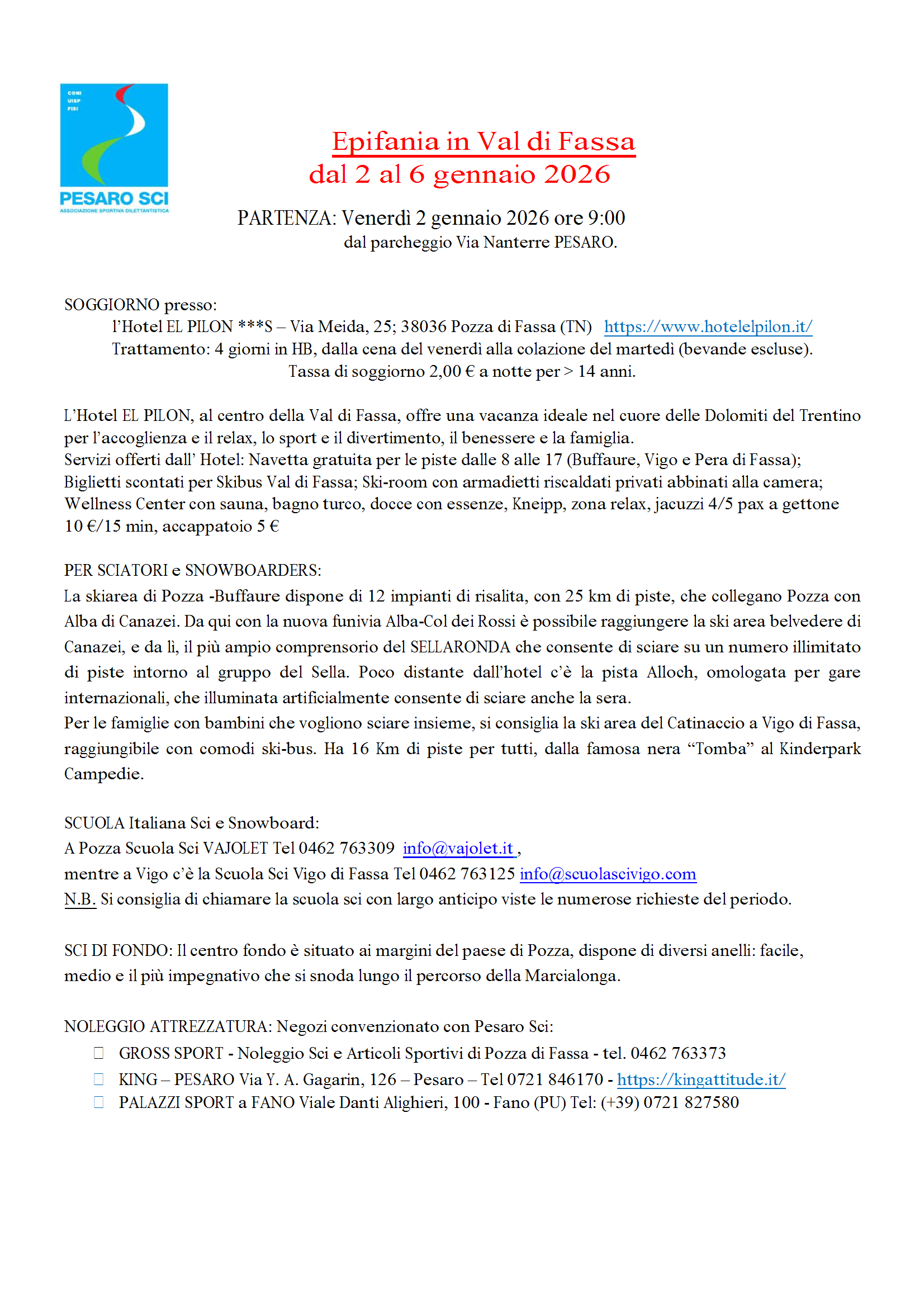 Il punto di incontro per le nostre partenze in pullman, salvo indicazioni contrarie, è situato a Pesaro, presso il parcheggio del campus scolastico di Via Nanterre.